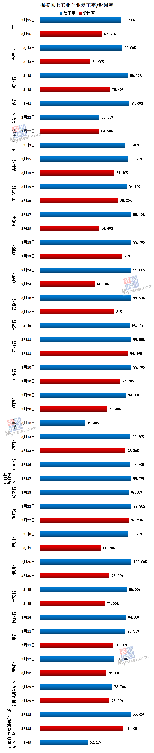 截止统计日期,25省市规模以上工业企业复工率超过90%,江苏、江西、湖南、重庆、新疆等省份人员返岗率超过90%。