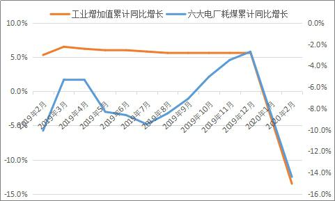 国内六大电厂耗煤与工业增加值增速呈现正相关性。据笔者测算,2020年1-2月份国内六大电厂耗煤量3048.34万吨,同比下降14.4%。同期,规模以上工业增加值下降13.5%。截至3月23日,2020年1-3月份国内六大电厂耗煤量4234.8万吨,同比下降16.6%。